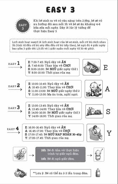 - Nên nhớ, nếp sinh hoạt EASY 3không phải là áp đặt, hoàn toàn có thể nương theo con, miễn đáp ứng đủ tổng giờ thức trong ngày và ăn cách nhau 2.5 – 3 tiếng, tách bạch ăn và ngủ.